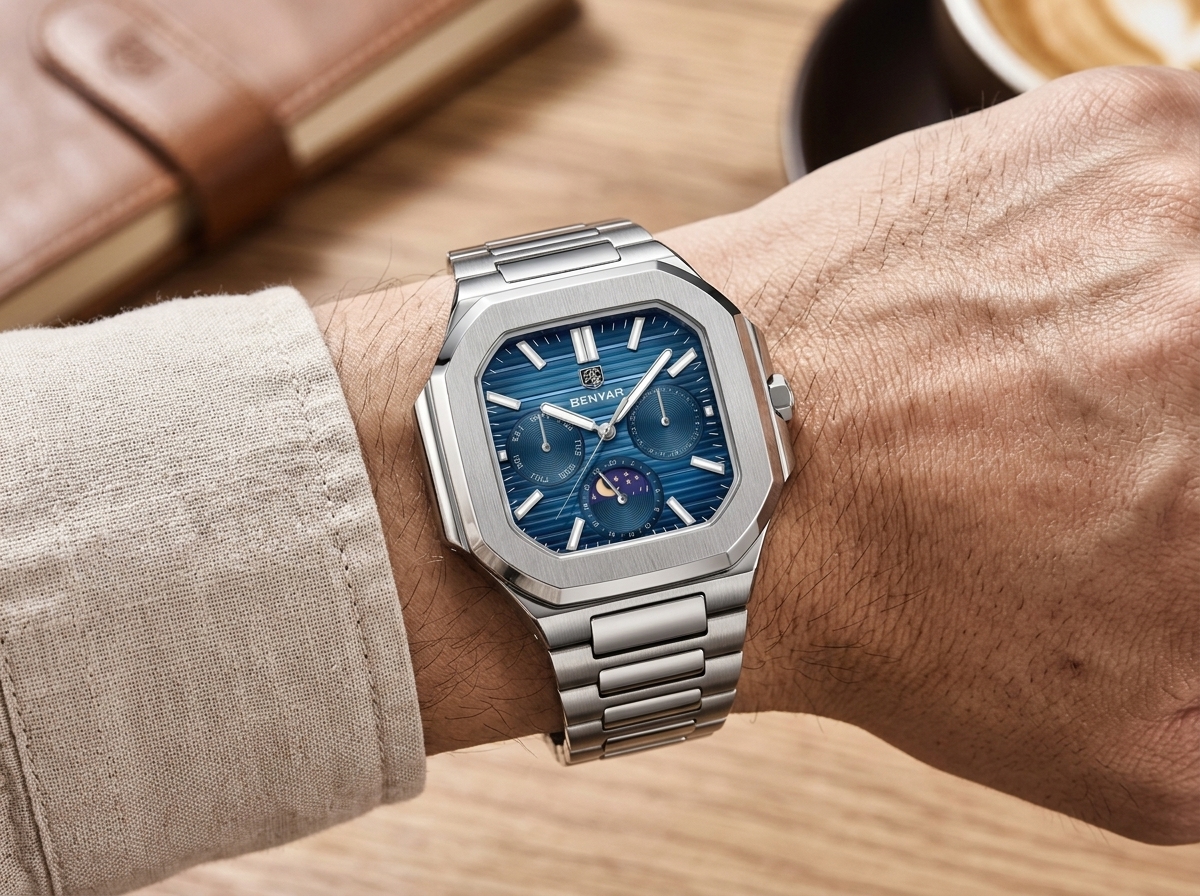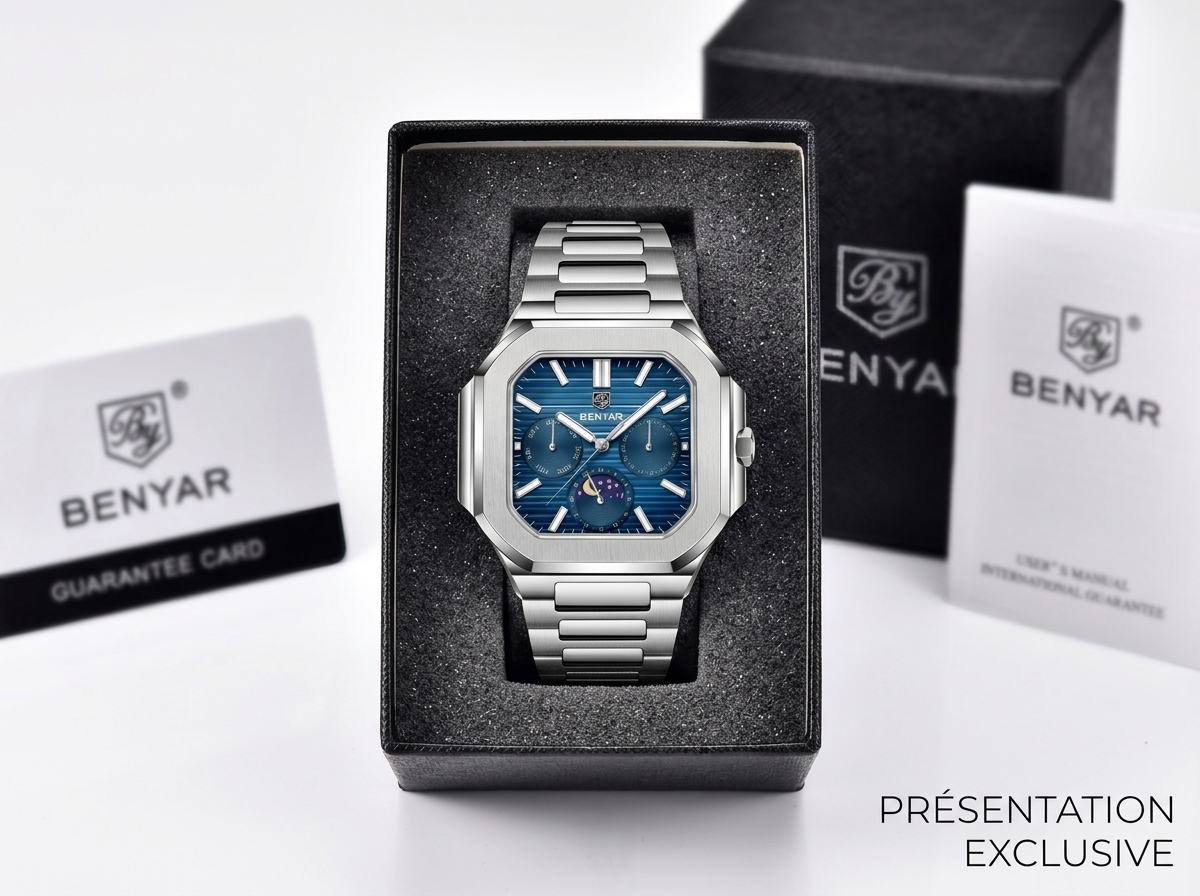 Découvrez l’élégance audacieuse de cette montre BENYAR, une fusion parfaite de robustesse et de raffinement. Son cadran bleu texturé et ses multiples complications en font un accessoire incontournable pour l’homme moderne.