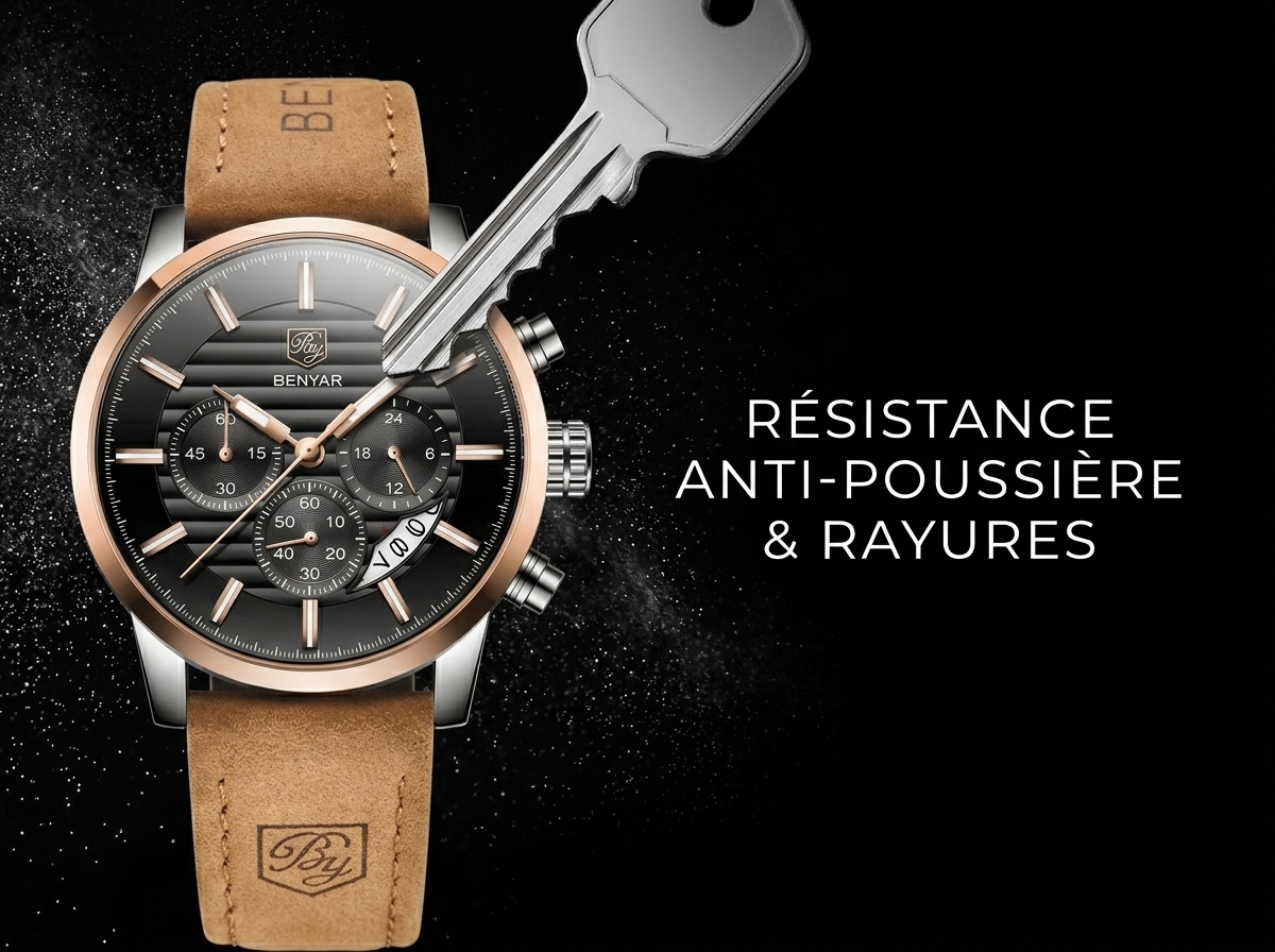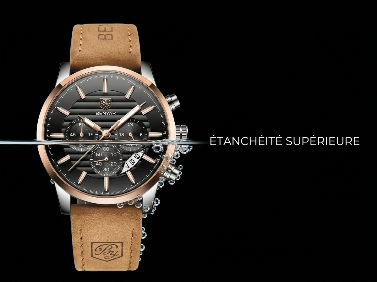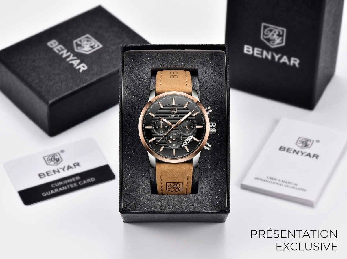 Ce garde-temps élégant allie fonctionnalité sportive et sophistication décontractée avec son cadran noir et ses accents or rose. Parfait pour rehausser votre style quotidien avec une touche de luxe discret.