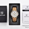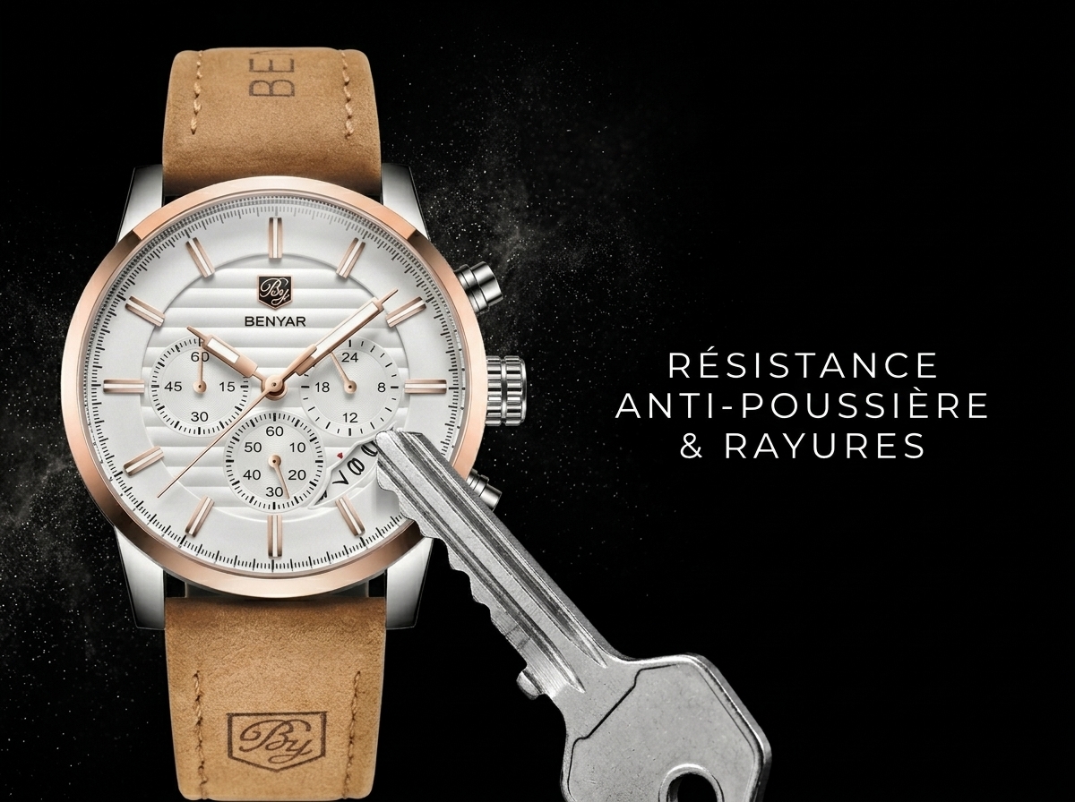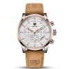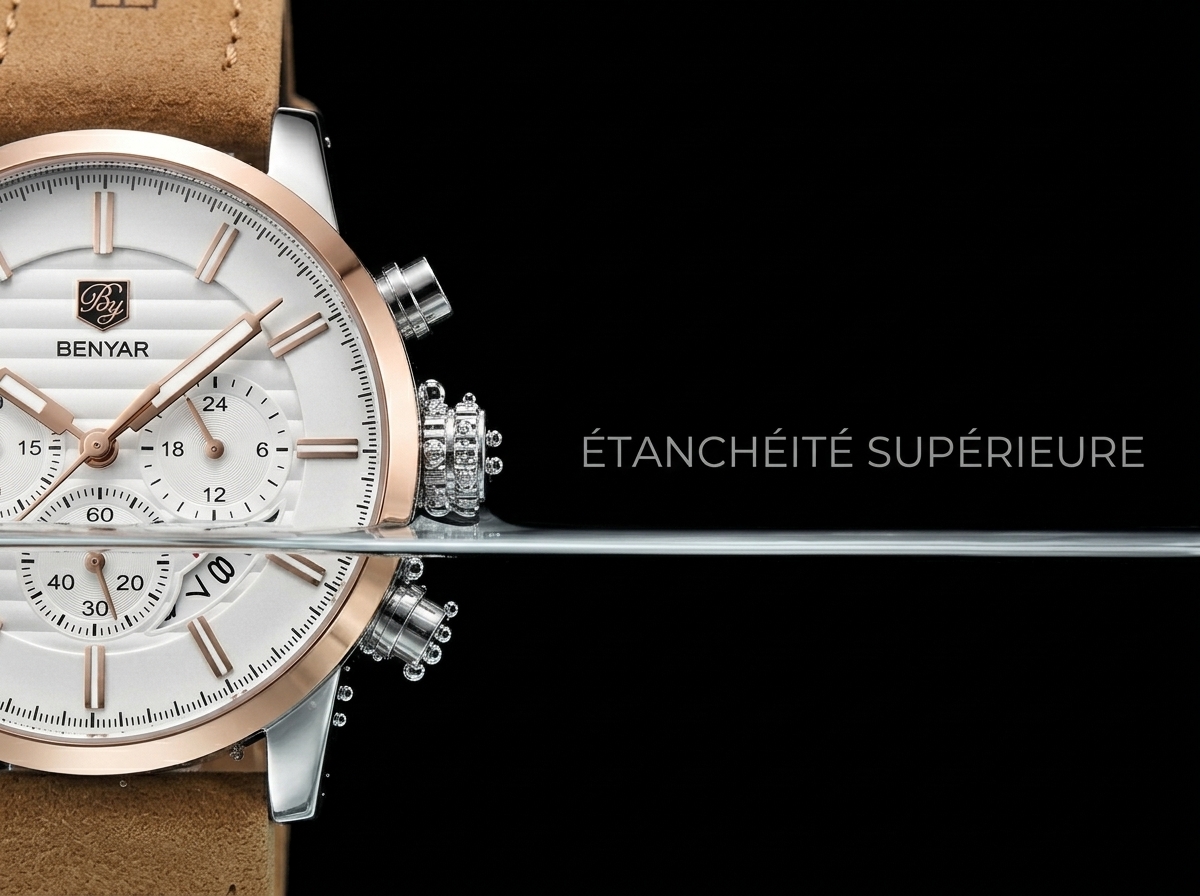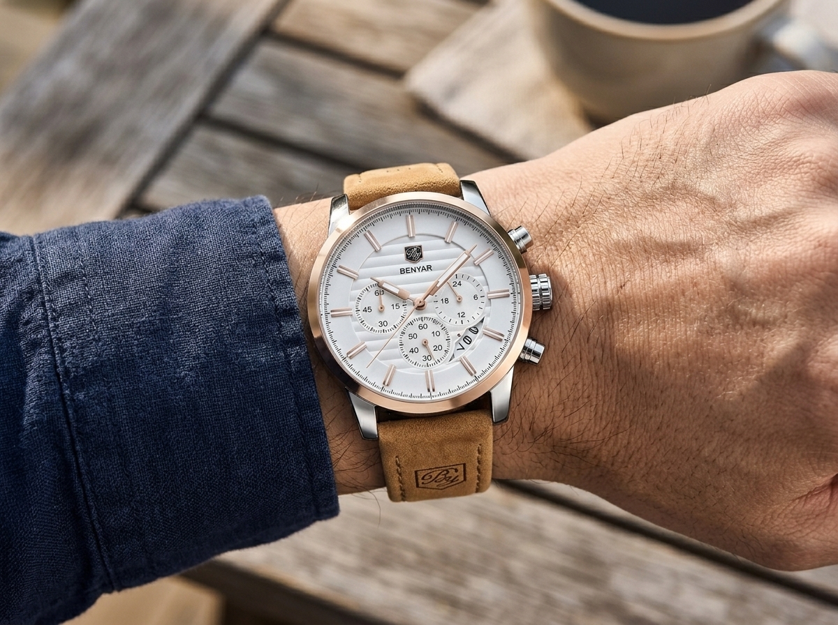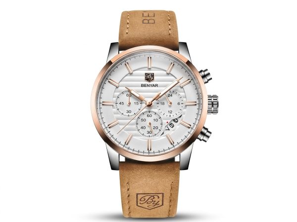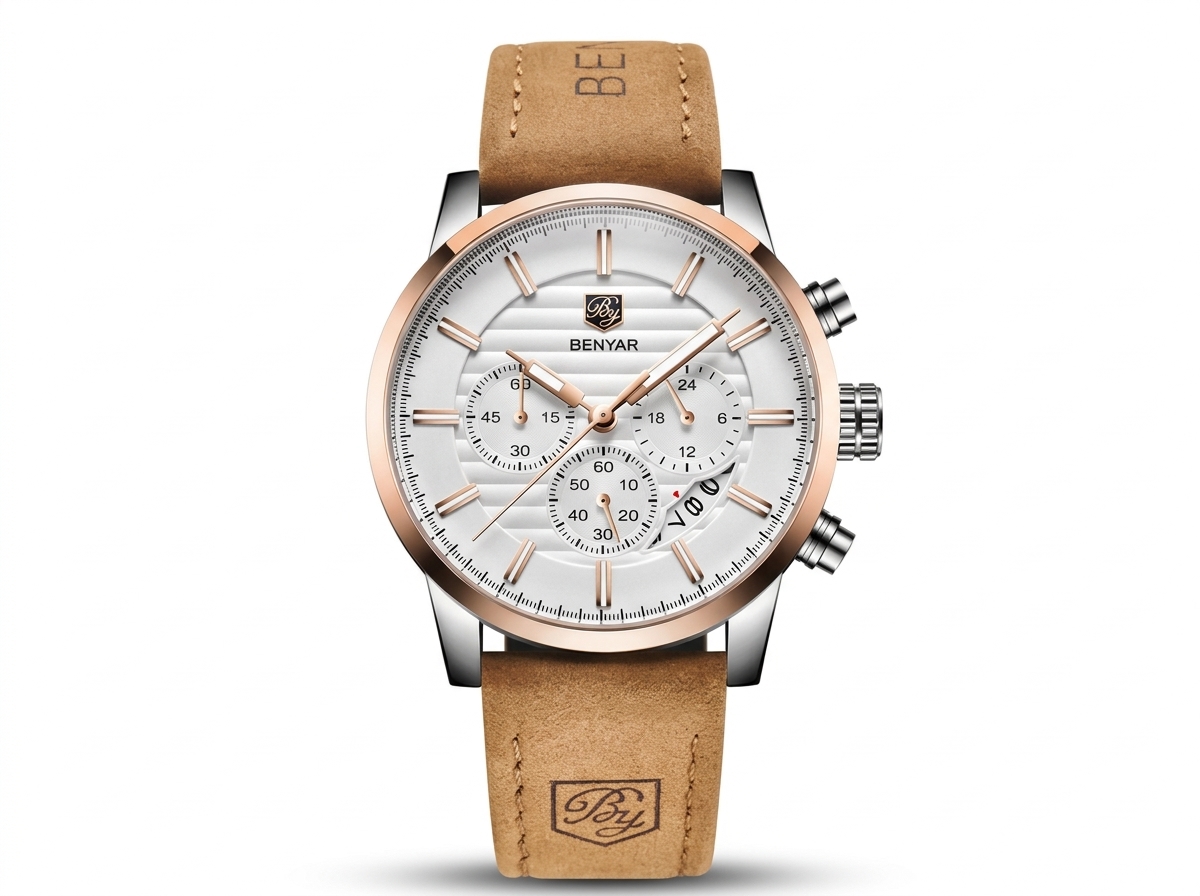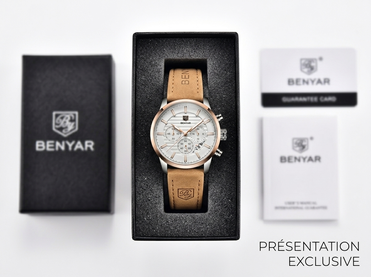 Découvrez l’élégance audacieuse de cette montre BENYAR, combinant un cadran blanc texturé avec de sublimes accents en or rose. Son bracelet en cuir camel doux offre un contraste raffiné, parfait pour un style distinctif au quotidien.