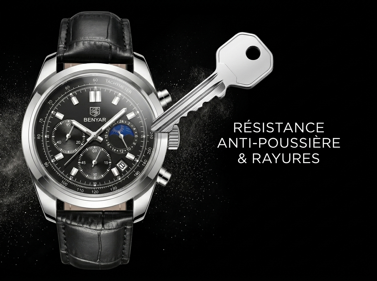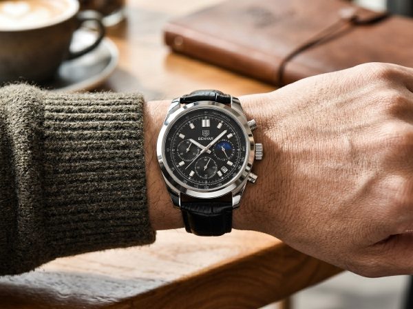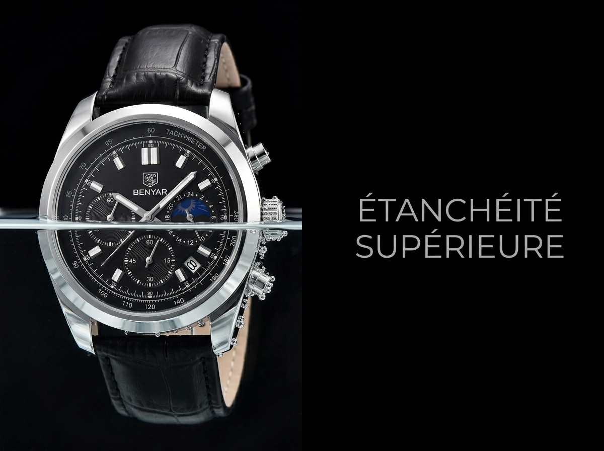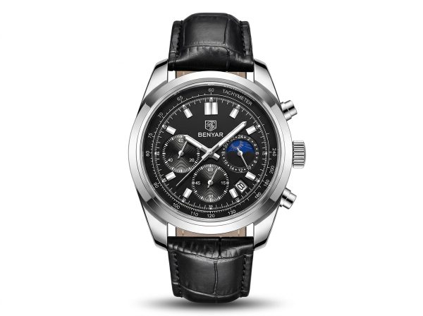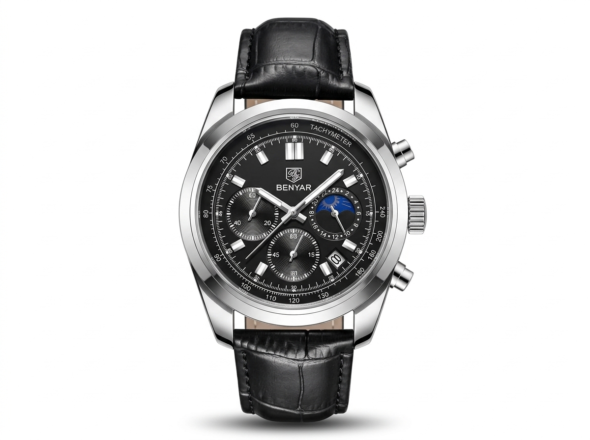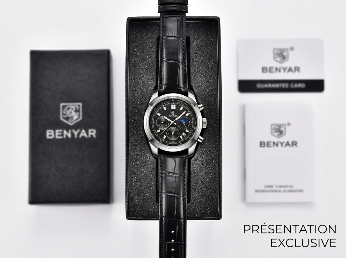 Ce chronographe Benyar allie sophistication et fonctionnalité avec son cadran noir profond et son bracelet en cuir texturé. Parfait pour rehausser n’importe quelle tenue, il offre une lecture précise et un style intemporel.