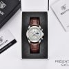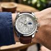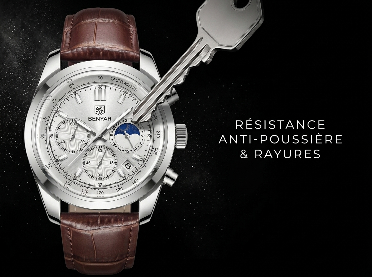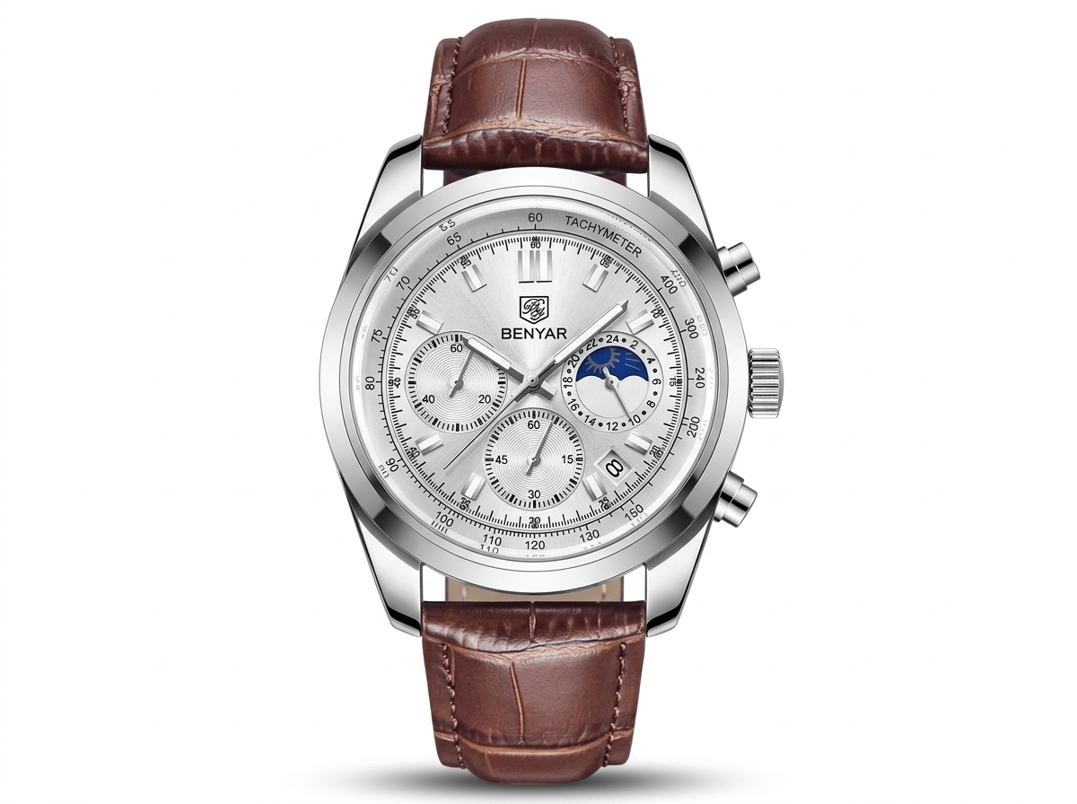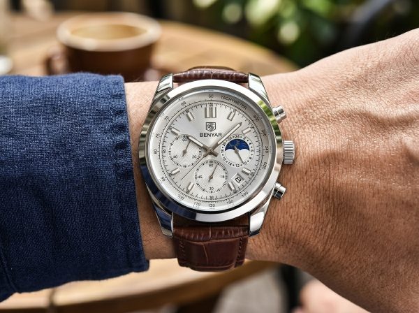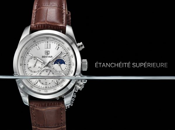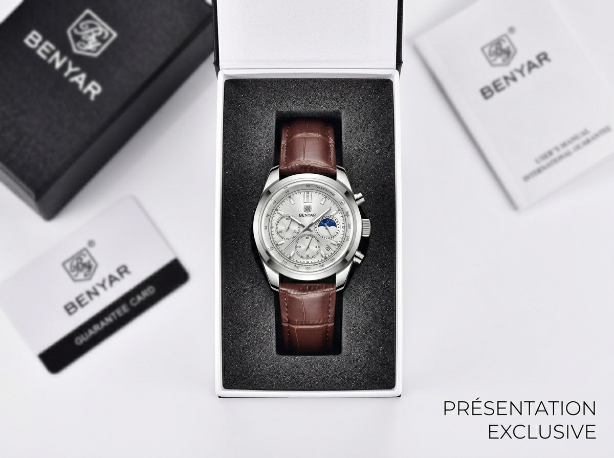 Ce garde-temps BENYAR incarne l’élégance classique avec une touche de sophistication moderne, parfait pour l’homme soucieux de son style. Dotée d’un chronographe fonctionnel et d’une indication des phases de lune, elle allie performance et esthétique raffinée pour chaque instant.