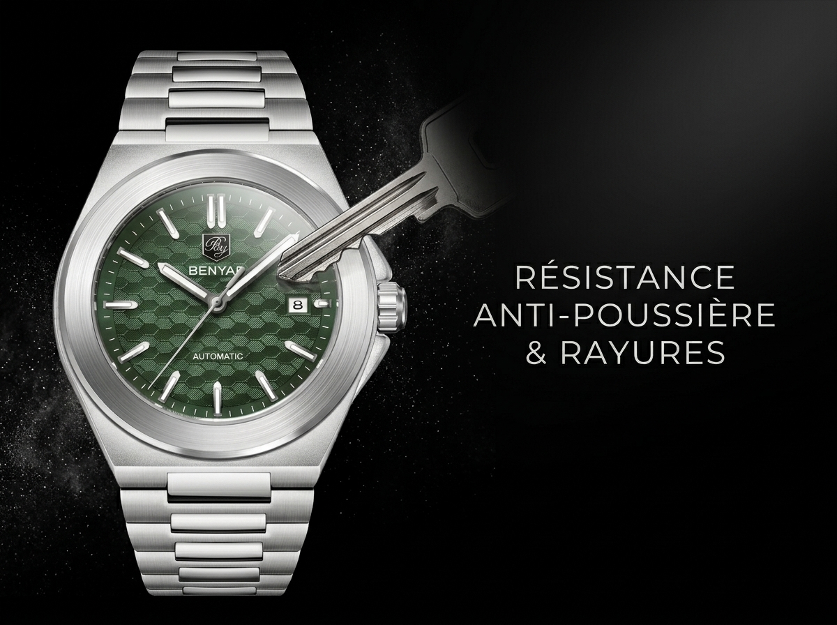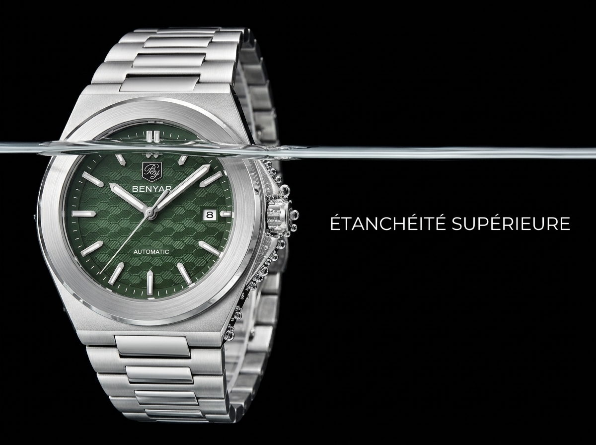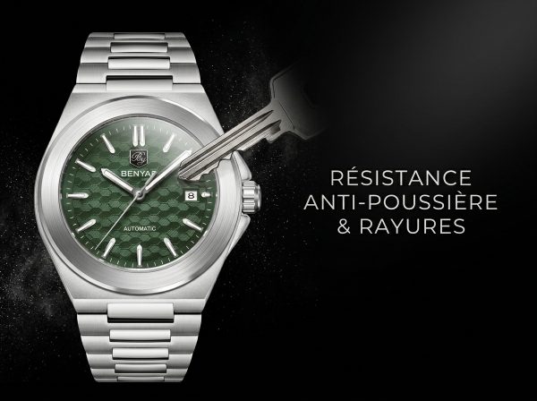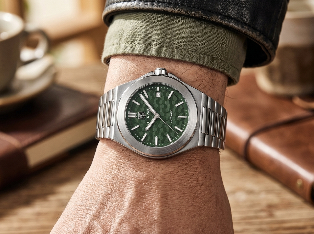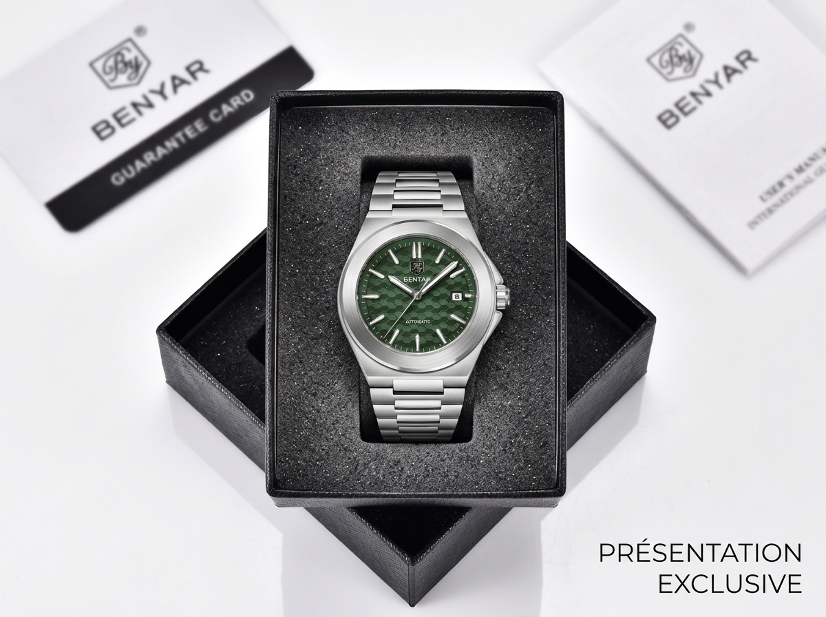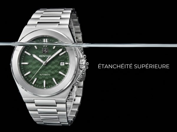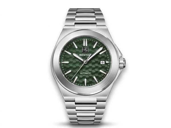 Découvrez l’élégance audacieuse de cette montre automatique BENYAR, dotée d’un cadran vert texturé en nid d’abeille et d’un boîtier en acier inoxydable intégré. Parfaitement conçue pour le quotidien, elle allie robustesse et style sophistiqué pour l’homme moderne.