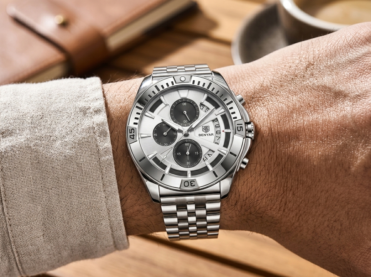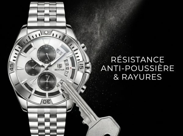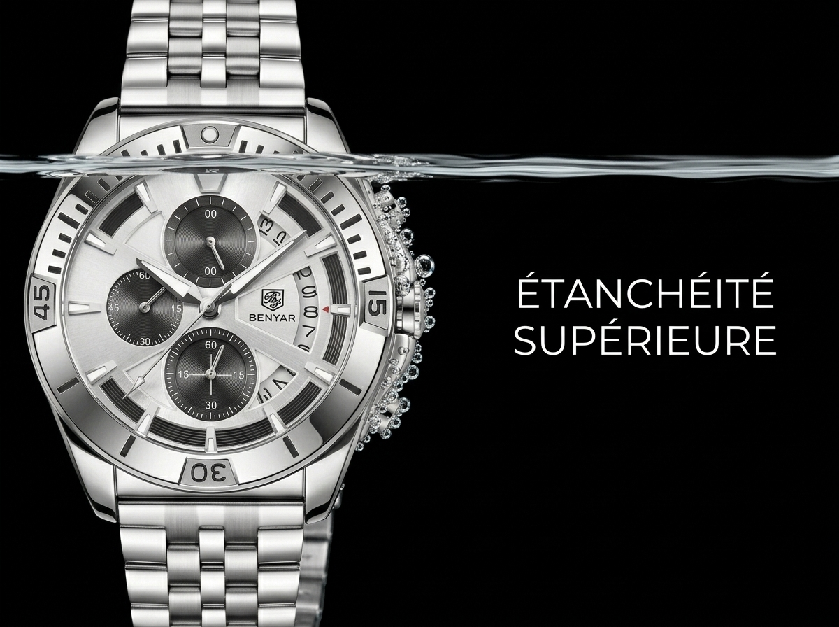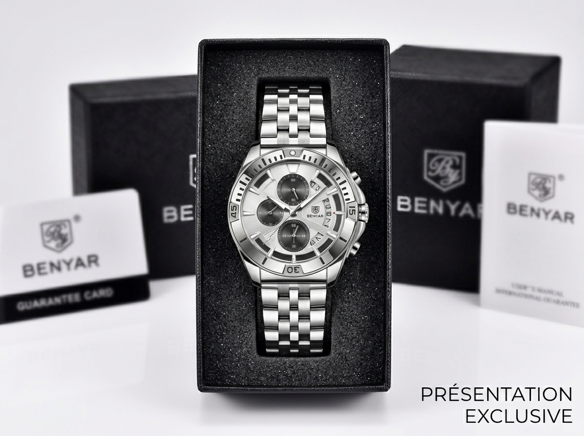 Optez pour l’élégance audacieuse et la précision sportive avec cette montre BENYAR au design chronographe raffiné. Son esthétique tout acier et son cadran multifonctionnel en font le compagnon idéal de chaque instant, alliant performance et style.