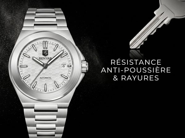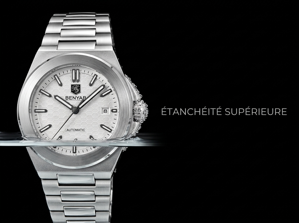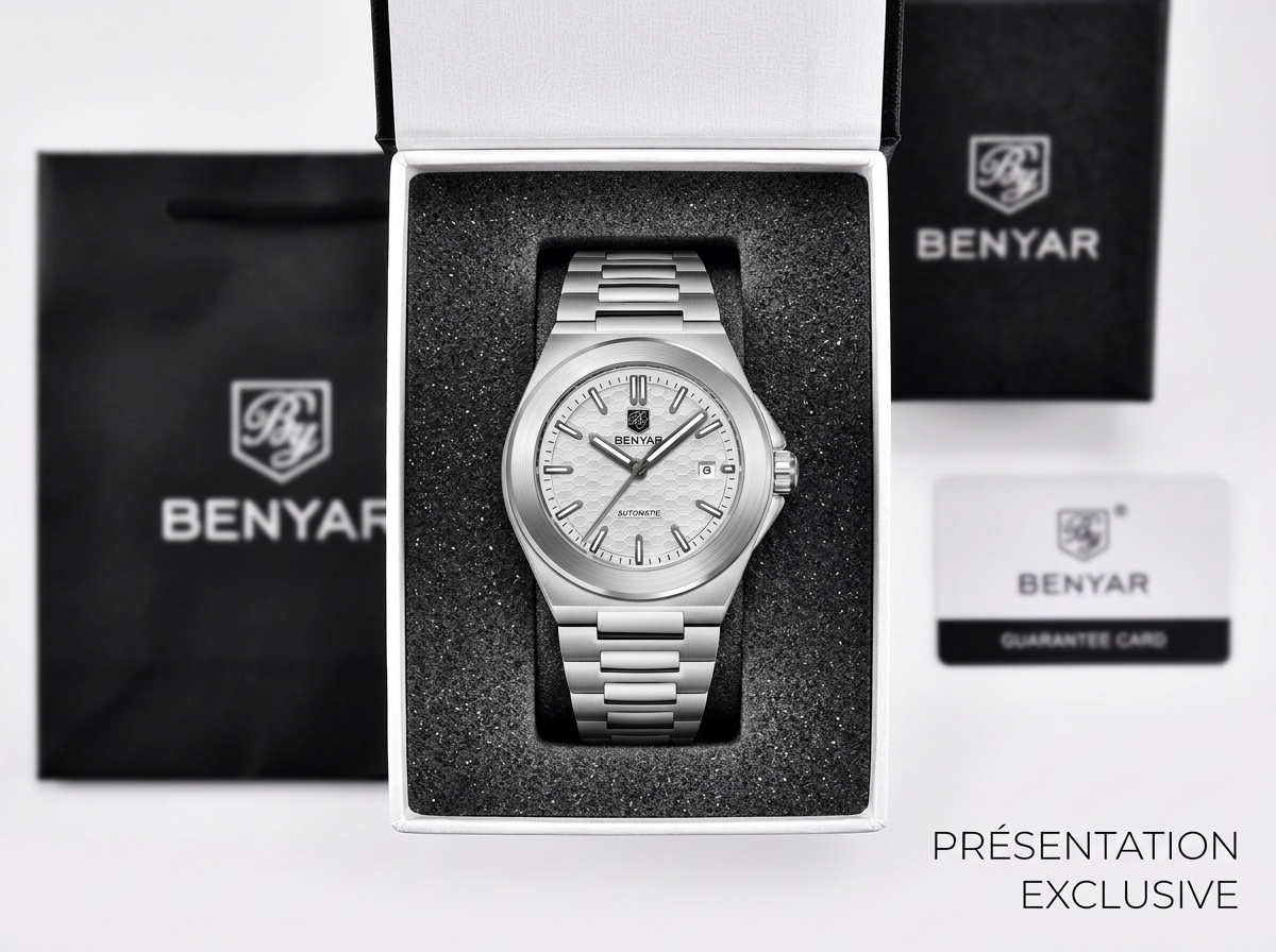 Découvrez la montre automatique Benyar, une fusion parfaite d’élégance moderne et de robustesse sportive. Son cadran texturé nid d’abeille et son boîtier octogonal en acier inoxydable en font un accessoire incontournable pour un style affirmé.