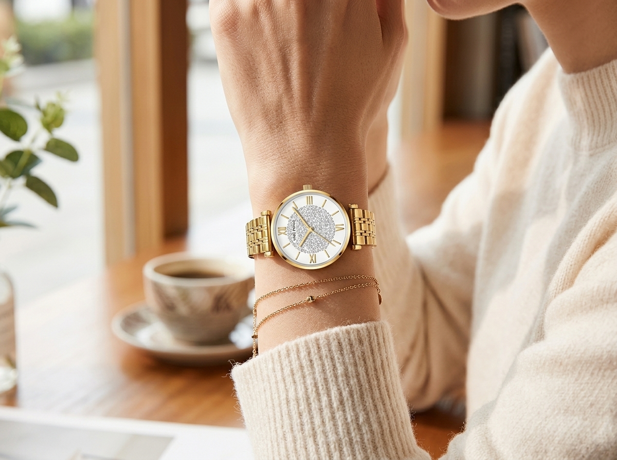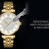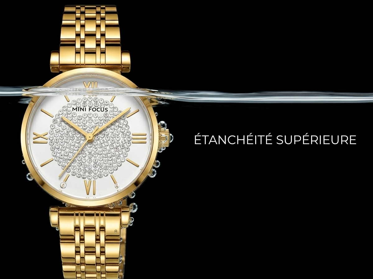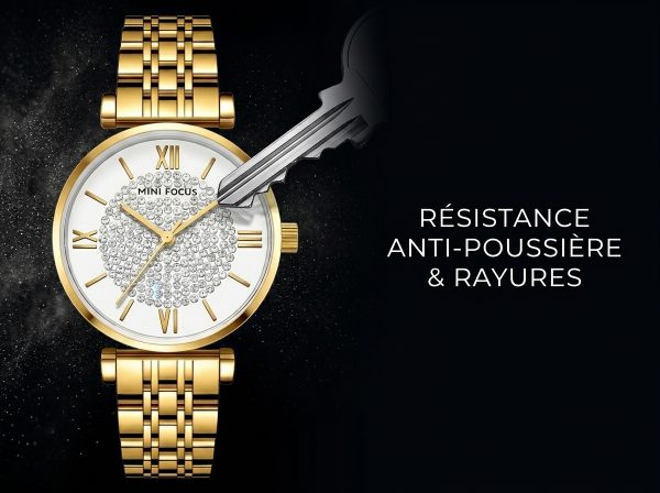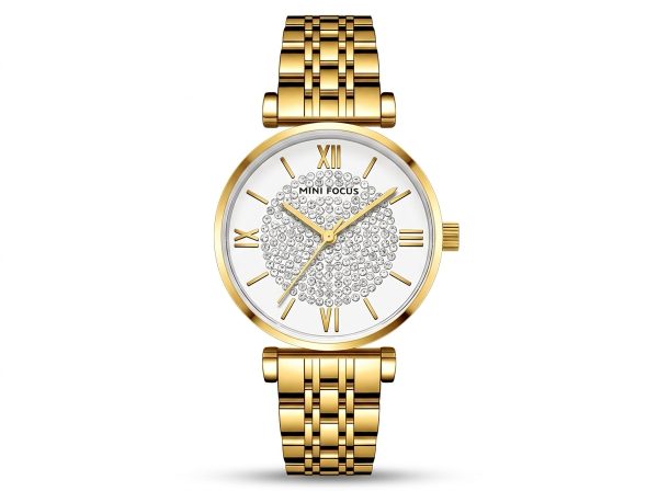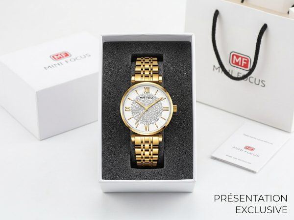 Découvrez l’éclat sophistiqué de cette montre MINI FOCUS dorée, un bijou horloger conçu pour la femme moderne. Son cadran orné de cristaux scintillants et ses index romains apportent une touche de glamour intemporel à votre poignet.