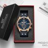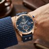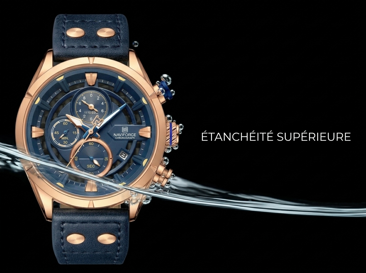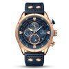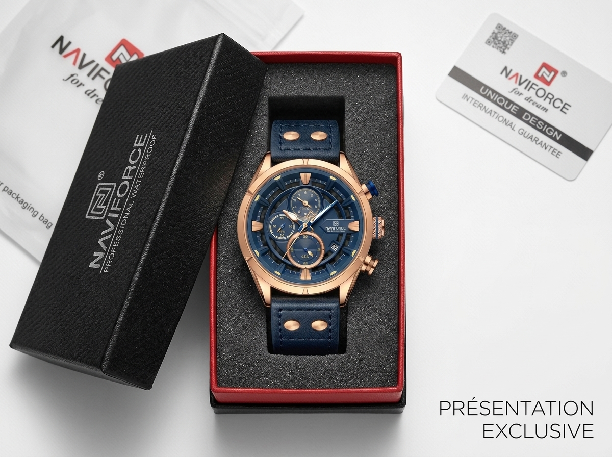 Découvrez l’élégance audacieuse de cette montre chronographe, une fusion parfaite de fonctionnalité sportive et de style raffiné. Son boîtier or rose et son cadran bleu profond, associés à un bracelet en cuir marine, en font un accessoire incontournable pour toute occasion.